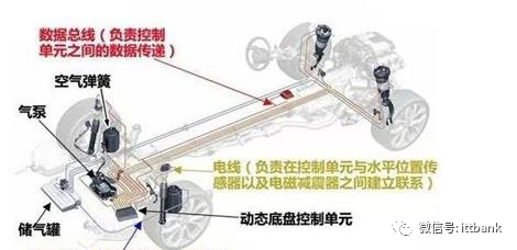 空气悬挂系统:空气悬挂是一种主动的电子悬挂,核心部件包括控制器、空气泵、储压罐、气动前后减振器和空气分配器等部件,来控制车身的水平运动,调节车身的水平高度以及调节减振器的软硬程度。