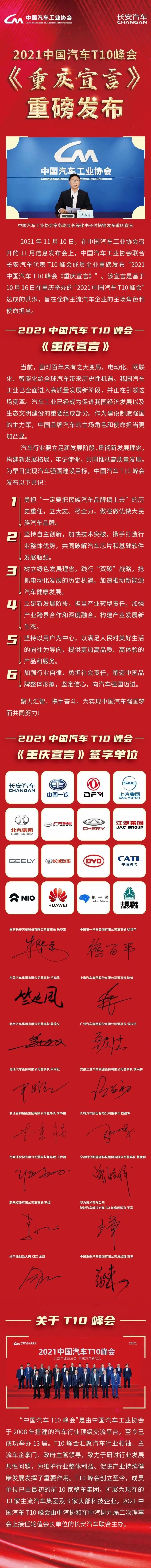 2021年11月10日下午,在北京举办的中汽协11月份信息发布会上,世界汽车组织(OICA)主席、中国汽车工业协会常务副会长兼秘书长付炳锋发布了中国汽车T10峰会重庆宣言。以下为发言全文。 很高兴在今天下午的中汽协11月份信息发布会上再次与大家见面。我受中国汽车T10峰会的委托,在这里就T10峰会的共识做一个发布。T10峰会是由中国汽车工业协会于2008年搭建的汽车行业顶级交流平台,至今已成功举办13届。T10峰会汇聚汽车行业领袖、主流车企掌门、政府主管领导,致力于研讨行业发展共性问题,自创立以来,为维护行业整体利益、促进产业持续健康发展发挥了重要作用。在2008年成立之初,T10成员由主营业务收入居行业前10位的整车集团组成,即:一汽、东风、上汽、长安、北汽、广汽、江淮、奇瑞、华晨、重汽;随着民营车企的迅速崛起,吉利和长城陆续加入;近年来,产业转型升级加速,融合与重构成为变革主旋律, 2020年,在协会本届首年度轮值会长单位陈虹董事长建议下,以“开放、包容、融合、共赢”为原则,峰会成员单位结构再度调整,比亚迪和华为加入会议;2021年,T10峰会在12家成员单位的基础上又增加了2家整车企业和3家头部科技企业作为正式成员(即:比亚迪、宁德时代、蔚来、华为和地平线)。回顾十几年的历程,T10峰会成员单位已由最初的前10家整车集团,扩展为现在的13家主流汽车集团及3家头部科技企业。成员单位构成的变迁,也折射出近年来汽车产业的巨变。2021中国汽车T10峰会,于10月16日在重庆召开。本届峰会由中汽协和在中汽协九届二次理事会上接任轮值会长单位的长安汽车联合主办,并得到了汽车行业领袖、国家相关部委和T10峰会成员单位的大力支持。全国政协副主席万钢、工信部副部长辛国斌、发改委产业发展司副司长霍福鹏以及中国兵器装备集团有限公司董事长许宪平出席了此次峰会并讲话。15家峰会成员单位董事长或总裁级别的领导参加了会议。重庆市政府相关领导、中汽协秘书处领导列席了会议。 本届峰会召开的大环境,是当前世界百年大变局正加速演进,十四五规划正扬帆起航。中国汽车行业正站在迈向高质量发展、圆梦汽车强国的关键节点上,面临全球能源环境危机、产业链加速重构、消费结构与客户需求深度变化、新兴技术快速迭代等一系列挑战。2021中国汽车T10峰会以“共建产业新生态,开创汽车新纪元”为主题,聚焦芯片、智能网联、“双碳”目标落实、新能源、中国品牌等当前汽车行业热点、重点问题,探讨应对方案、谋划转型蓝图,形成了发展共识。会议还讨论了在会后发布会议成果即“重庆宣言”的相关事宜。 峰会结束之后,组委会根据会议核心观点和共识,形成了“2021中国汽车T10峰会重庆宣言”,协会秘书处与T10峰会各成员单位开展了多轮互动进行完善,最终的定稿得到了各单位董事长或其授权代表的签名确认。 现在,受会长单位长安汽车的委托,由我代表T10峰会全体成员企业,将《中国汽车T10峰会重庆宣言》宣读如下:当前,面对百年未有之大变局,电动化、网联化、智能化给全球汽车带来历史性机遇。我国汽车工业已全面进入高质量发展新阶段,并正在引领这场变革。汽车工业已经成为促进我国经济发展以及生态文明建设的重要组成部分。作为建设制造强国的主力军,中国品牌汽车的主场角色和使命担当更加凸显。汽车行业要立足新发展阶段,贯彻新发展理念,构建新发展格局,牢记使命,共同推动高质量发展。为早日实现汽车强国建设目标,中国汽车T10峰会发布以下共识:一、 勇担“一定要把民族汽车品牌搞上去”的历史重任,立大志、尽全力,做强做优做大民族汽车品牌。二、 坚持自主创新,加快技术突破,携手打造行业整体优势,共同破解汽车芯片和基础软件发展瓶颈。三、 树立绿色发展理念,践行“双碳”战略,抢抓电动化发展的历史机遇,加速推动新能源汽车健康发展。四、 立足新发展阶段,担当产业转型责任,加强产业跨界合作和深度融合,构建产业发展新生态。五、 坚持以用户为中心,以满足人民对美好生活的向往为导向,提供更加高品质、高体验的产品和服务。六、 加强行业自律,勇担社会责任,塑造中国品牌整体形象,坚定信心,向汽车强国迈进。聚力汇智,携手奋斗,为实现中国汽车强国梦而共同努力!