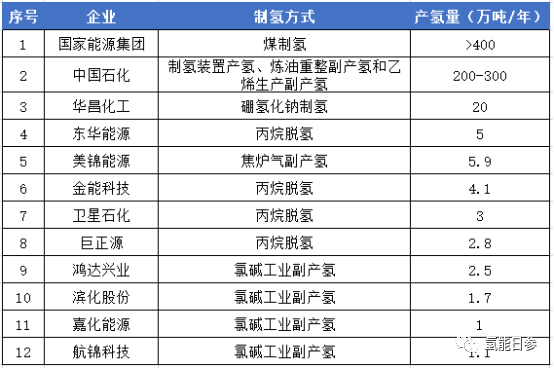 表1为我国当前主要制氢企业。