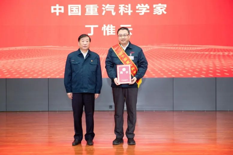 ▲中国重汽集团公司党委书记、董事长谭旭光为首次聘任的中国重汽科学家丁惟云颁发聘书