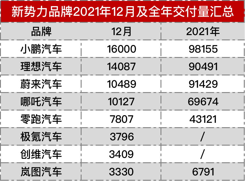 从榜单来看,小鹏汽车的表现无疑是最亮眼的,最近三个月都拿下月度销冠。数据显示,小鹏汽车在12月共交付新车16000辆,其中小鹏P7交付7459辆,P5交付5030辆,仍然是销量最高的新势力品牌。从年度交付量来看,小鹏汽车在2021年累计交付新车98155辆,领先蔚来汽车拿下年度销冠。