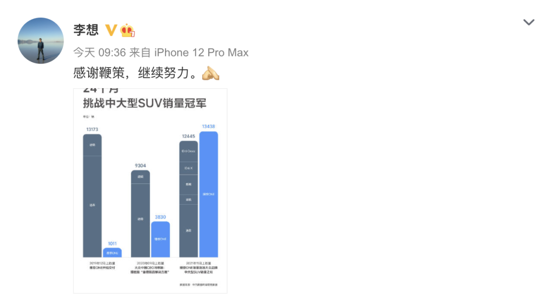 理想汽车在12月份的交付量为14087辆,也就是理想ONE一款车型的交付量就是14087辆,是目前国产新势力中销量最高的产品,这个成绩在国内新能源产品中已经算是不错的。此前,大众汽车中国CEO冯思翰公开表示,借助化石燃料的燃烧为汽车动力系统发电是一种 “糟糕的解决方案”。与此同时,大众汽车集团(中国)研发部门负责人威德曼表示,增程式已经是过时的技术,发展潜力不大。然而,当前作为增程式的理想ONE的市场表现却让人刮目相看。12月22日,李想在微博上发文,内容特别简单仅有八个字:“感谢鞭策,继续努力”。