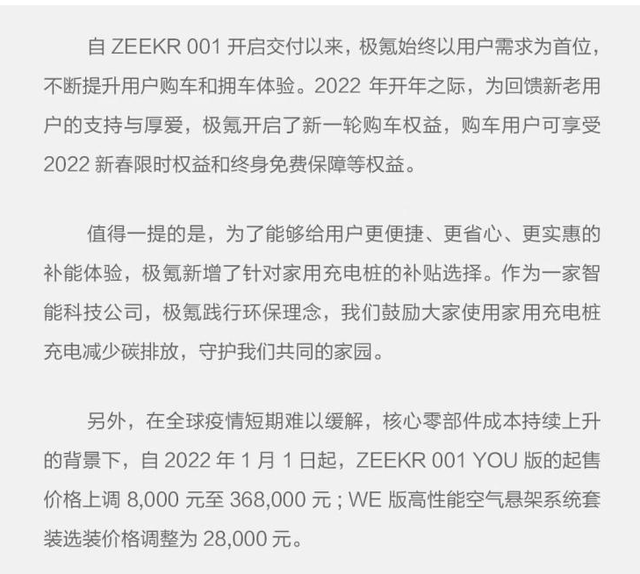 极氪汽车和岚图汽车并不是真正意义上的造车品牌,毕竟是传统自主品牌成立的,与蔚小理等还是有一定区别,但是成立的时间并不长。极氪是吉利旗下高端新能源品牌,在11月份交付了2012辆极氪001,12月则交付了3796辆,目前正在稳定交付中。值得一提的是,今天极氪汽车还宣布涨价,ZEEKR 001 YOU版车型于2022年1月1日起,起售价格上调8000元至368000元,官方给出的原因是核心零部件成本持续上升。