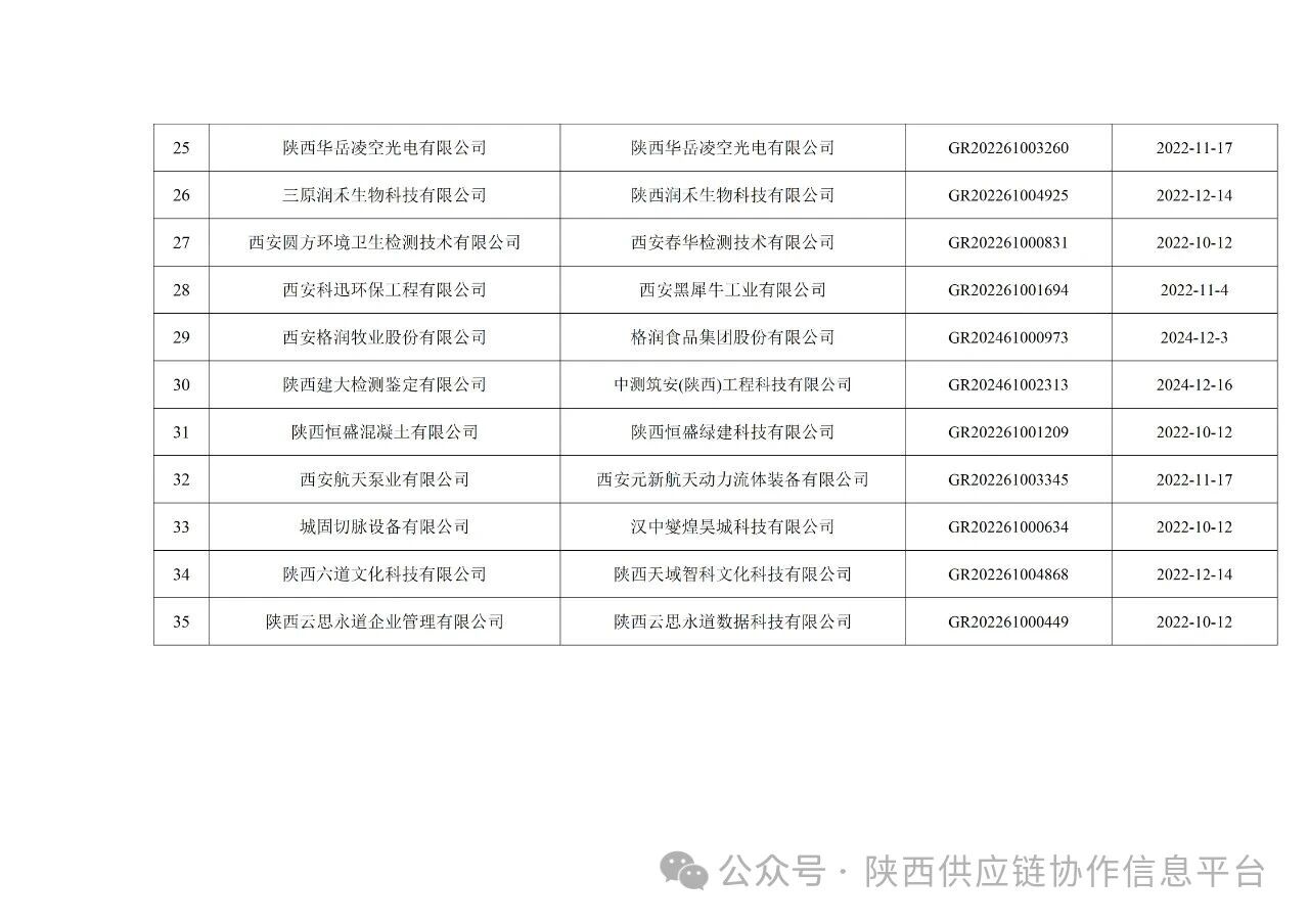 根据《高新技术企业认定管理办法》(国科发火〔2016〕32号)、《高新技术企业认定管理工作指引》(国科发火〔2016〕195号)有关规定,经企业申请、省高企办审核,现将陕西省2025年第四批35家拟更名高新技术企业名单予以公示,公示期为10个工作日。如对企业更名有异议,请列举理由及必要证据材料,提供真实姓名和有效联系电话,在公示期内以书面形式反映至指定邮箱。凡匿名、冒名或超出期限的异议均不予受理。