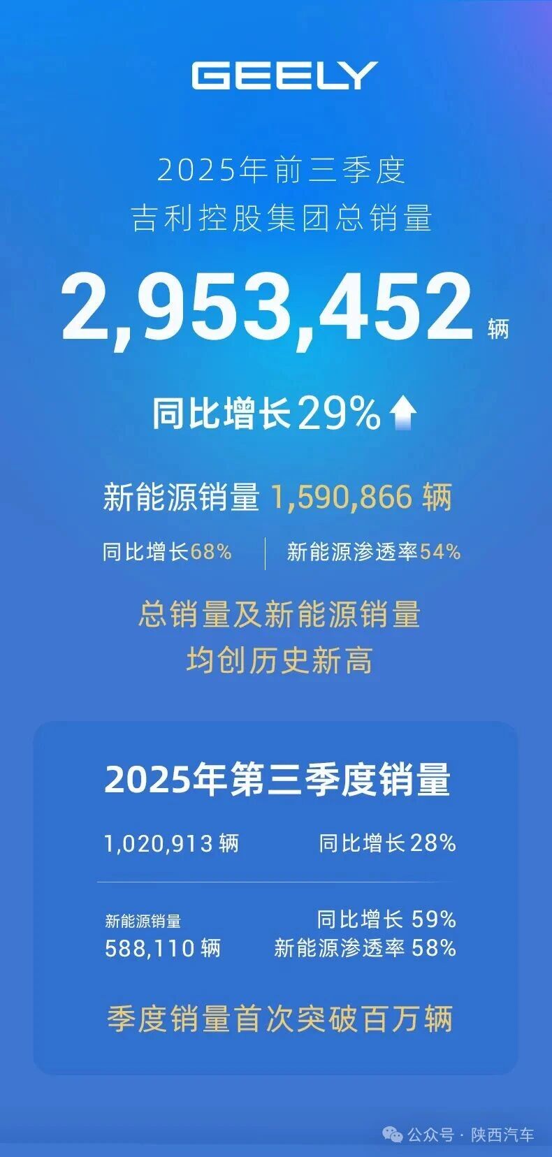 吉利控股集团前三季度总销量295万辆 同比增长29%