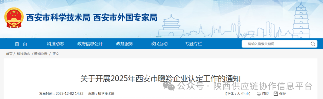 为深入实施创新驱动发展战略,加快培育壮大我市瞪羚企业群体数质量,按照《西安市支持科技企业提质增效实施方案(2025—2027年)》《西安市瞪羚企业认定管理办法》有关要求,现就开展2025年西安市瞪羚企业培育认定有关事项通知如下。