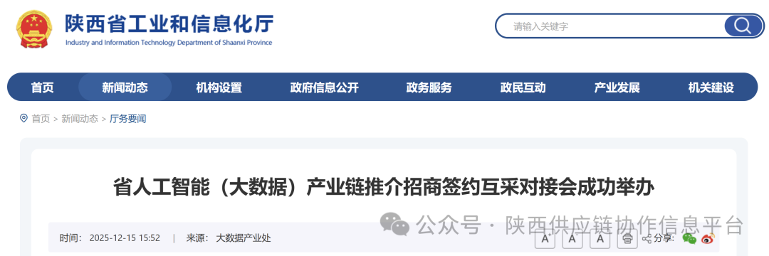 12月11日下午,由省工业和信息化厅主办、省区域大数据产业协会协办的省人工智能(大数据)产业链推介招商签约互采对接会在西安召开。本次会议聚焦产业链协同、技术成果转化与金融赋能,搭建合作交流平台,促进产业精准对接。省工业和信息化厅党组成员、副厅长朱磊参加会议并作产业链发展情况报告,省级有关部门,地市工业和信息化局、人工智能和大数据产业主管部门,有关院校、金融机构及产业链有关企业负责人约180人参加会议。