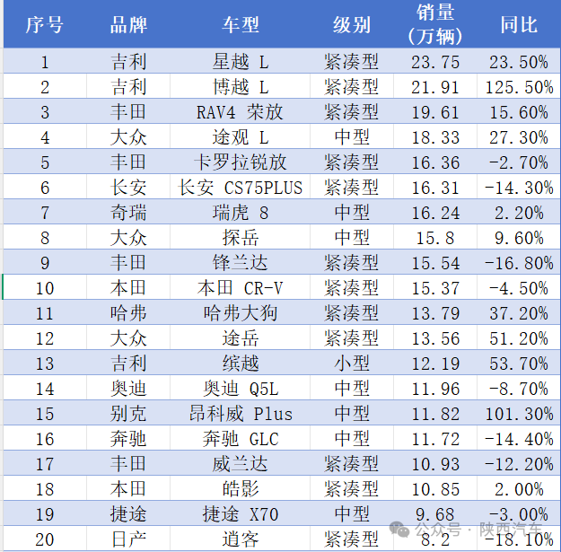 这两款“陕西籍”车型总销量合计超过45万辆,以绝对优势包揽燃油SUV销量冠亚军。 榜单前三名中,吉利独占两席,丰田RAV4荣放以19.61万辆位列第三。这一成绩打破了合资品牌长期垄断SUV销量榜的局面,彰显了陕西汽车制造业的强劲实力。
