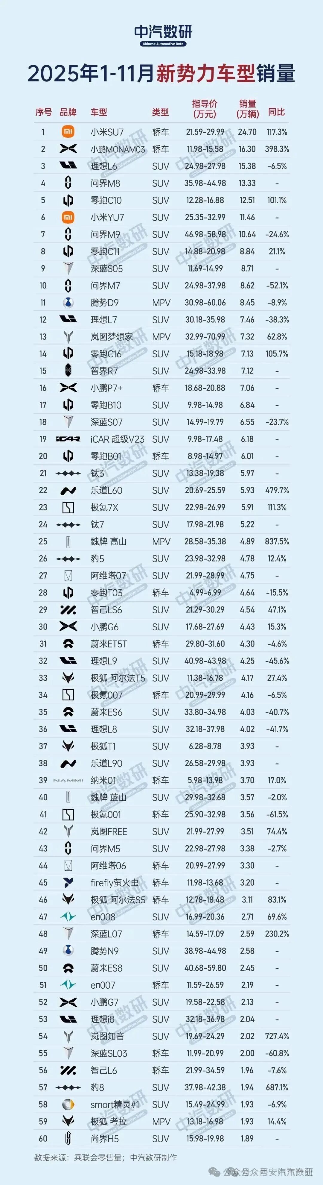 小米SU7断档式领先!1-11月新势力车型累计销量榜出炉