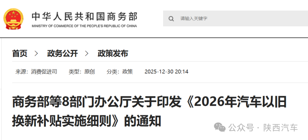 本细则自2026年1月1日起执行。各省级商务主管部门会同相关部门根据本细则并结合本地区实际情况制定汽车以旧换新具体实施细则,稳妥推进补贴政策顺畅有序衔接过渡。