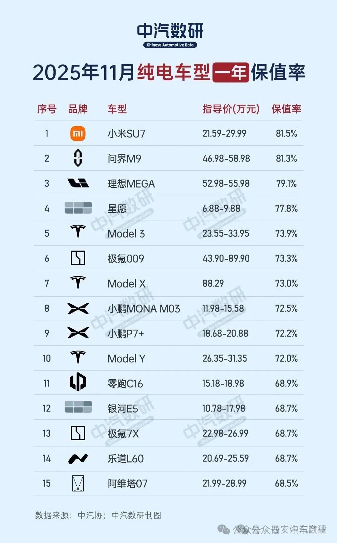 2025年11月新能源汽车保值率排行榜(插混/纯电)