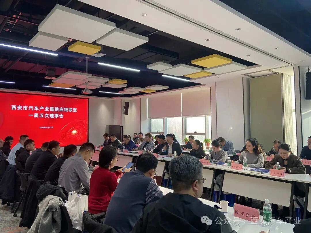 2026 年 1 月 12 日,西安市汽车产业链供应链召开联盟一届五次理事会。市工信局领导,陕汽、比亚迪、西安吉利、法士特集团、西安弗迪电池等链主企业及联盟理事长、副理事长、常务理事、理事单位代表,新进成员单位、特邀代表参加会议。