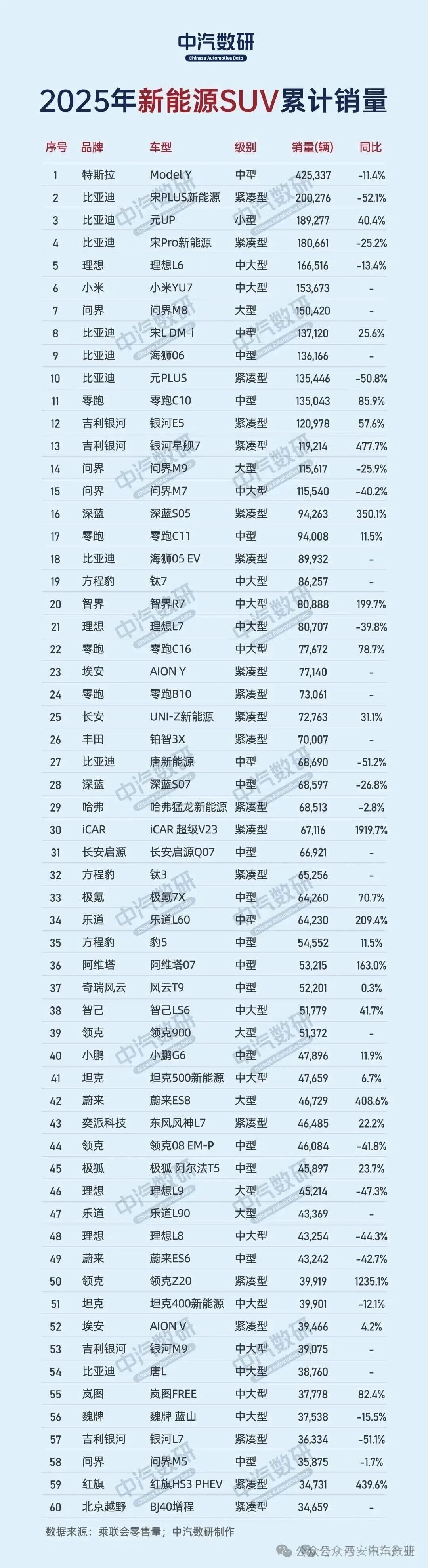 2025年度新能源汽车累计销量排行(轿车/SUV)