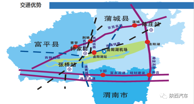 区域位置优异,位于西安、渭南、蒲城、富平和阎良交汇处,可直接接受中心城市产业、科技、资金、技术、人才、信息等辐射。距离蒲城12公里、距离富平13公里、距离渭南35公里、距离咸阳机场92公里、距离西安78公里。地广人稀,土地开阔平坦,近期可利用土地面积172km²起步区134km²内无基本农田,可供建设用地7万亩,拓展空间大,供给速度快。