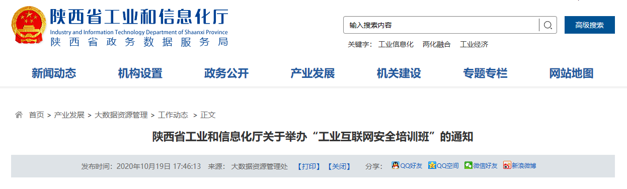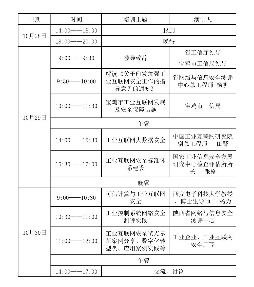 为贯彻落实工信部等十部委联合下发的《关于印发加强工业互联网安全工作的指导意见的通知》(工信部联网安〔2019〕168号)和《陕西省人民政府办公厅关于深化“互联网 先进制造业”发展工业互联网的实施意见》(陕政办发〔2019〕27号)文件精神,强化企业安全主体责任,推进我省工业互联网安全防护工作,提升工业互联网从业人员安全意识及安全防护技能,我厅定于10月28日至30日在宝鸡市举办陕西省工业互联网安全培训班。现将有关事项通知如下: