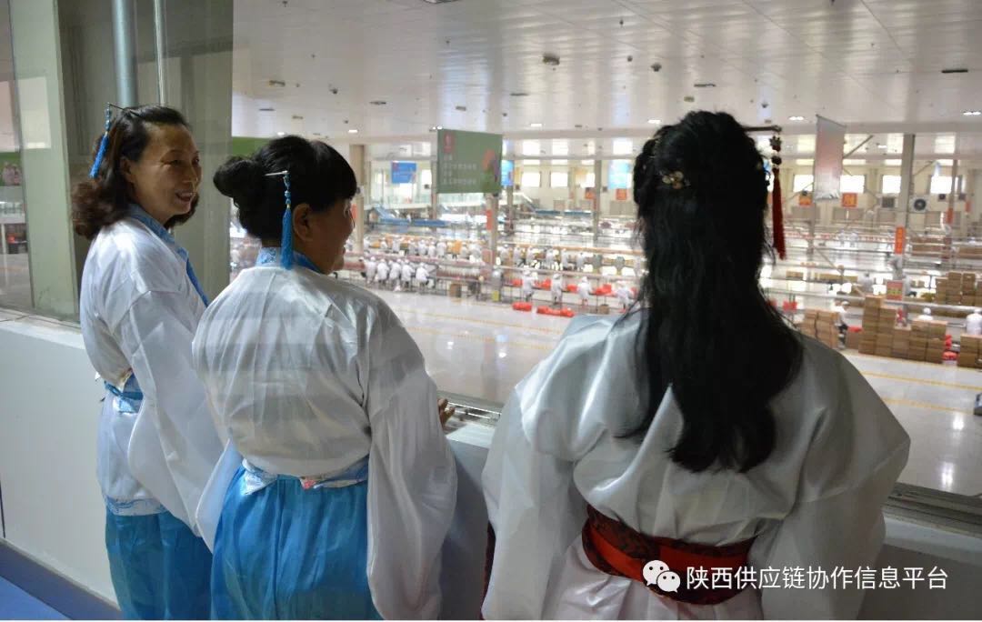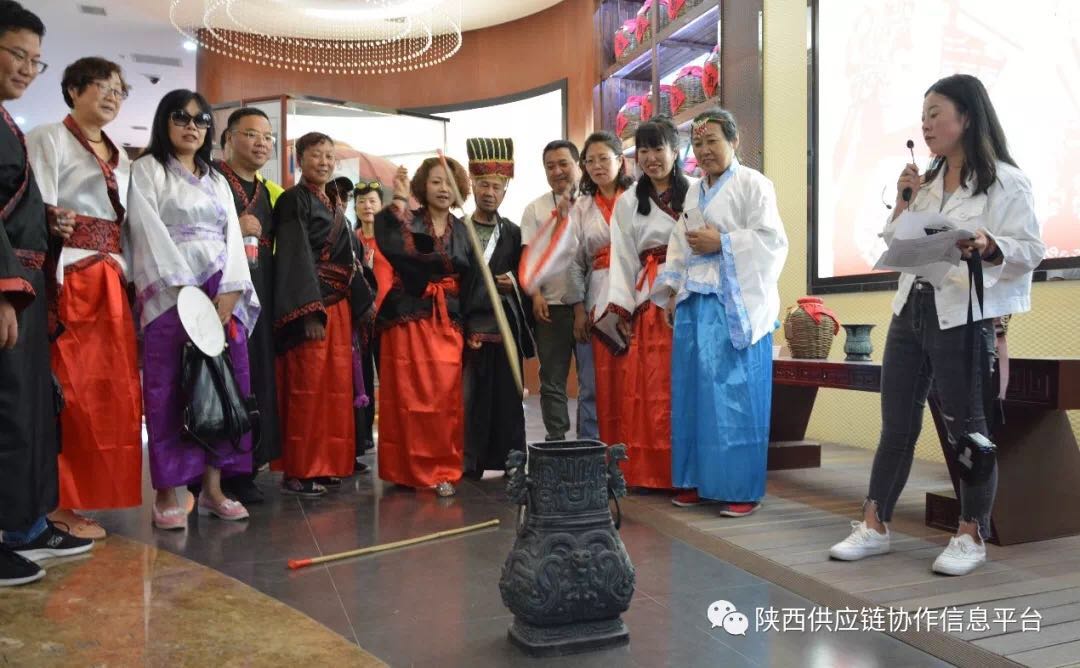 西凤酒厂讲解员为身着中国传统服饰的游客们讲解西凤酒工艺
