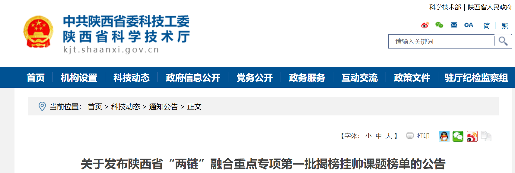 为切实解决制约陕西重点产业发展的“卡脖子”技术问题,提升科研投入绩效,根据陕西省科技厅《实施科技项目“揭榜挂帅”工作指引》有关规定,拟采用“揭榜挂帅”方式实施一批“两链”融合重点专项攻关课题。现发布第一批课题榜单,面向全国公开征集解决方案和承担单位。