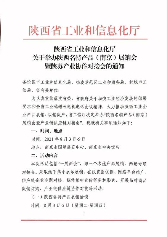 | 为认真贯彻落实省委、省政府关于加快工业经济发展的部署要求和全省工业稳增长电视电话会议精神,大力推动陕西工业企业产品展销、以销促产,省工信厅决定举办“陕西名特产品(南京)展销会暨产业链供应链对接会”。现就有关事项通知如下:本次活动包括“一展两会”,即一个名优产品展销,两场专题对接会。采取线下集中展示展销、在线直播促销、网络平台推广、供应链企业专题对接、媒体集中宣传等多种形式,开展品牌商品促销订购、产业链供应链协作对接等活动。 内容:拟在同期举办的“中国(南京)国际食品博览会”上,划定集中区域设立“陕西名特产品展销专区”,组织80余户我省食品、酒水饮料、轻工、消费电子和汽车等名优特新产品进行展示展销。“中国(南京)国际食品博览会”已举办9届,规模5万平方米,每届逾10万人参观,有6万余家长期合作的参展商,300万多家优质经销商、采购商,2000个经销商微信群、1500个采购商QQ群等数据资源,可借助博览会的聚集效应和商贸渠道,通过展会平台进行多省联动、资源互动和共享,拓宽销售渠道。 主要内容:围绕我省重点产业链,以陕-苏两省汽车产业协作发展为主题,以精准招商,打通产业链断点、堵点为目标,组织两省相关整车及零部件制造企业进行推介和交流,整车企业发布发展规划和配套需求;零部件企业发布规划并进行产品推介;地市园区进行投资环境推介;有意向双方进行对接交流。 参会人员:陕苏两省及有关地市工信部门,陕西省相关整车制造企业、工业园区,两省零部件制造企业,有关商协会。 主要内容:邀请知名电商供应链平台相关人员与会对接,分享供应链中小企业培育及渠道扩展方案,解答企业数字化转型中遇到的问题及疑虑,学习类似企业发展案例,帮助企业运用供应链平台拓展国际国内市场,提升企业数字化管理能力。 参会人员:陕苏两省及有关地市工信部门,陕西省相关制造企业、工业园区,知名电商供应链平台代表,参展参会企业代表,有关商协会。(一)各市(区)工信主管部门要高度重视,安排专人负责,组织特色优势企业名优特新产品及推介项目参加展销活动,主动洽谈对接,严禁假冒伪劣产品参展。(二)本次展销活动统一布展,不收取企业展位费、搭建费,并免费提供展品往返物流运输服务(大型装备除外),参展参会企业食宿交通费用自理。(三)请各市(区)工信主管部门于6月25日前报送组展工作负责人及联络员名单(附件1),7月10日前报送参展企业汇总表及参展企业信息登记表(附件2、3),文件及表格可在省工信厅门户网站首页通知公告栏下载。张 昉 029-63915564 13700279312龚振宇 029-63915564 13891854366