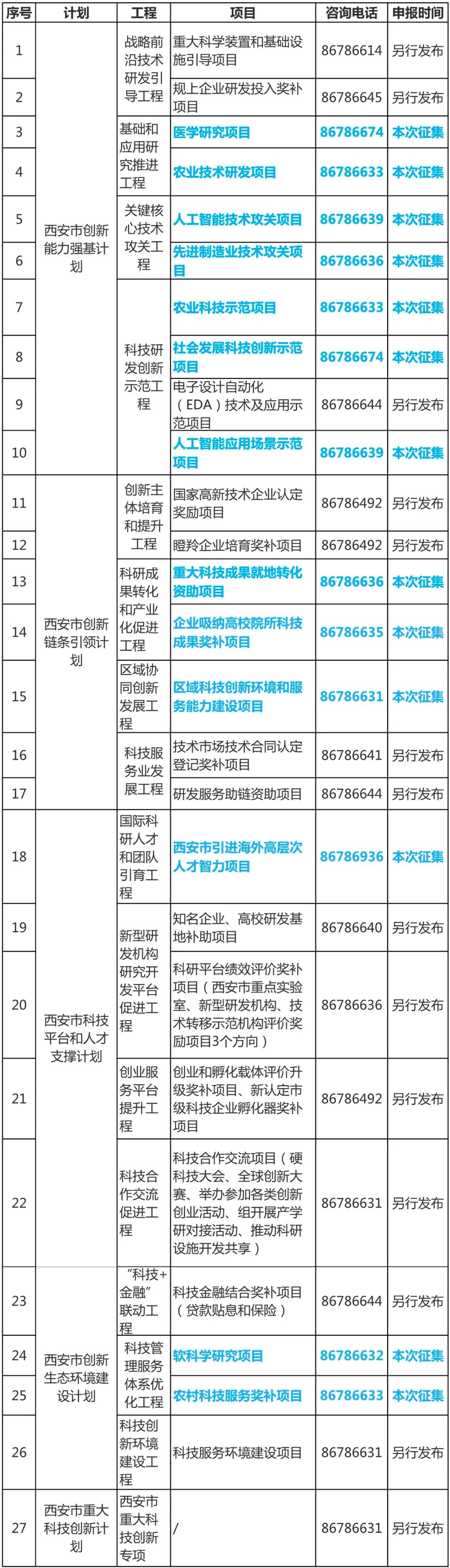 为深化创新驱动发展战略,贯彻落实国家和我省、我市科技创新工作任务,支持秦创原创新驱动平台建设,促进科技创新资源开放共享,2021年西安市科技计划项目组织以支撑“丝路科创中心”建设为目标,坚持围绕产业链部署创新链、围绕创新链布局产业链,重点是推动科技创新资源、要素配置、人才队伍体系化,促进科技与经济紧密结合和协同发展,强化基础研究能力建设,促进科技成果转化,提高科技创新服务能力水平,营造更好的创新创业环境,促进产业链供应链优化升级。现发布2021年度西安市科技计划项目申报指南,并就有关工作通知如下:2021年计划体系共设置5类计划,包括16类工程(专项),共27种项目。(一)科技计划项目线上申报。指南中发布的各类计划项目均须通过线上和线下申报。线上申报登陆“西安市科技政策服务综合管理系统”(网址:http://data.xast.cn:8080),进行注册并登录填报。具体操作流程详见附件。(二)计划项目推荐及审核。需由区县(开发区)或归口管理单位以正式文件推荐上报的项目,项目单位须将申报材料报送至区县(开发区)或归口管理单位的科技管理部门,由科技管理部门会同财政部门审核后,由科技管理部门将申报材料、推荐函和推荐项目汇总表(附表1)统一报送。(三)线下申报及提交申报材料。完成线上申报后,在线打印西安市科技计划项目申报书,并将申报书与附件装订成册,按时限要求报送至受理点。可行性报告、企业发展规划、商业计划书、项目实施方案等其他申报材料格式要素要完整,申报表格和编制提纲可在项目申报平台下载。为避免人员聚集和项目受理截至日前“扎堆”报送材料,开始受理纸质材料后,审核通过的项目须在5个工作日内报送。(四)申报材料装订及其他要求。申报材料简装成册(一式五份)。以区县(开发区)、园区为申报主体的项目,各区县(开发区)科技管理部门、财政部门或园区根据评审立项、推荐工作需要,可自行组织企业提供补充材料。年度计划项目申报将结合工作任务以及各类项目具体情况,分批次组织实施,本次征集项目的受理时限安排:网上申报时间:2021年7月5日—2021年8月5日。纸质材料受理时间:2021年7月8日—2021年8月8日。(农业技术研发项目、农业科技示范项目、农村科技服务奖补项目、社会发展科技创新示范项目、医学研究项目等5类项目网络申报截止时间为2021年7月18日,纸质材料受理时间截至到2021年7月20日。)材料受理地点:西安市高新区锦业路与丈八四路十字,神州数码科技园,4号楼1层,西安科技大市场A4,A5工位。电话:68518787,68518762。(一)项目申报单位原则上是西安市辖区(含西咸新区)具有独立法人资格的企业、高校、科研院所等单位,能满足实施项目所需的研发条件与经费保障,具有健全的科研与财务管理制度。项目负责人须为承担单位的在职人员,并保证项目执行期内在职,且项目知识产权明晰。(二)禁止多头申报和重复申报,申报单位同一个项目只能通过单个推荐单位申报,不得多头申报和重复申报。(三)项目申报单位应实事求是、科学合理编制项目经费预算,除项目自筹资金外,项目单位应具备筹集科技计划实际扶持资金与申请资金差额的能力,并须出具资金承诺函。(四)实行科研诚信事前承诺,申报单位、项目负责人须于申报时签署并提交《西安市科技计划科研诚信承诺书》(附件2、附件3),严格遵守承诺,认真审核申报材料,杜绝夸大不实、弄虚作假。(五)实施科研失信联合惩戒,对违反科研诚信的单位和个人,实行项目立项一票否决,并按照国家关于进一步加强科研诚信建设的有关要求纳入社会信用体系实施联合惩戒。(六)申报限制。已经被纳入社会信用体系实施联合惩戒的单位和个人不得申报或参与申报;已经获得市级财政资金支持的同一项目不得申报;同一项目不得申报不同的科技计划类别;承担在研(未验收)市科技计划项目的负责人不得申报;承担市科技计划项目验收不合格的,按照相关规定在规定期限内不得申报项目。市科技局将积极做好政策咨询和项目申报服务工作,严格执行工作纪律,并诚恳接受社会监督和投诉(西安市科技局机关纪委:86786659)。为了高效解答相关咨询,请按计划类别、项目平台、资金平台、材料受理等问题分类咨询。市科技局从未委托任何单位或个人为项目申报单位代理资金申报事宜,申报单位必须自主申报。凡是购买、委托代写项目申请书的,或是提供虚假证明材料的,一经发现查实,即视为骗取财政资金,一律不予受理、取消申请资格或撤销立项项目,并按规定严肃处理。市科技局将严格按照有关标准和程序受理,不收取任何费用。如有任何中介机构和个人假借我局领导和工作人员名义向申报单位收取费用的,请知情者及时向市科技局举报。附件:(进入官网http://xakj.xa.gov.cn/kjdt/tzgg/60dee9e1f8fd1c0bdc37a4a9.html下载)