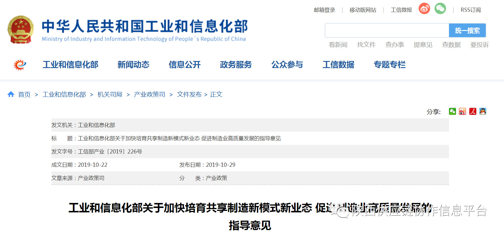 《关于加快培育共享制造新模式新业态 促进制造业高质量发展的指导意见》原文链接:http://www.miit.gov.cn/n1146285/n1146352/n3054355/n3057292/n3057299/c7491264/content.html