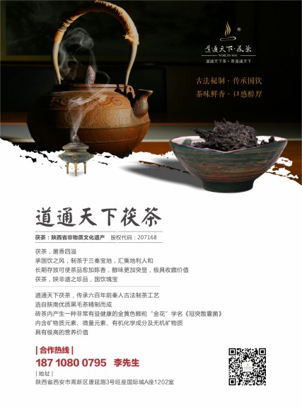“道通天下茯茶”是一家集“富硒”茶园种植、生产、加工、销售、茶文化传播及品牌运营为一体的专业化茯茶企业,是经陕西省政府批准的陕西省茶行业示范企业。道通天下茯茶其原料选自陕西安康平利县富硒含量最高的茶山,并于之签署了长达40年的排他性合作协议,是陕西唯一一家真正富硒茶原料的茯茶知名企业,道通天下茯茶在上海股权托管交易中心正式挂牌上市,股票代码为:207168。