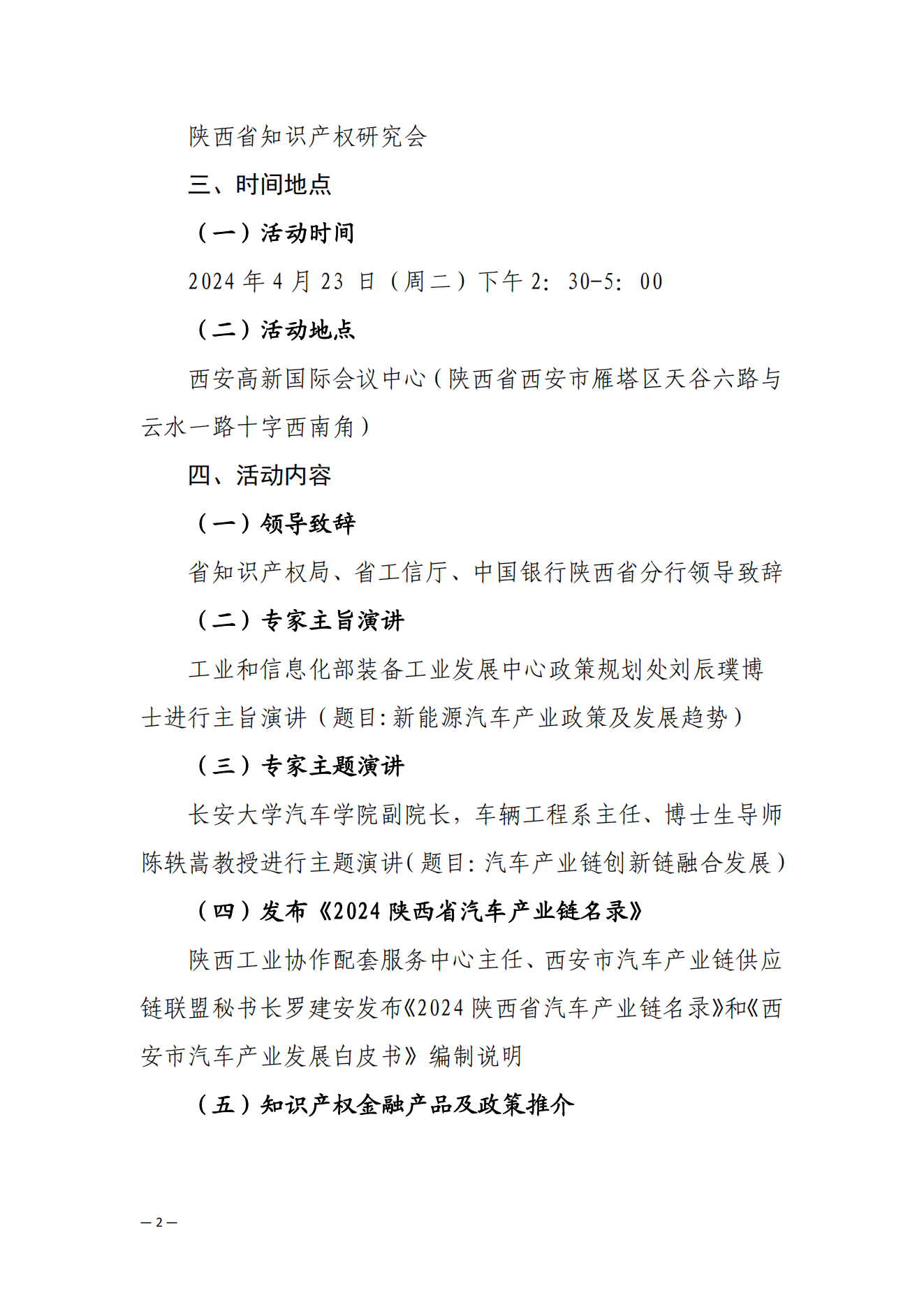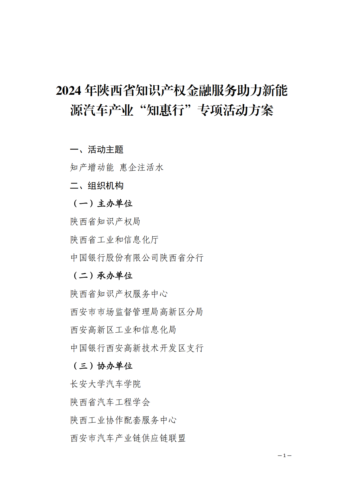 新能源汽车产业活力日益增强,正成为我省高质量发展的重要引擎。为落实国家知识产权局、中国银行《关于开展知识产权金融服务助力新能源汽车产业“知惠行”专项活动的通知》,现定于4月23日下午举办陕西省知识产权金融服务助力新能源汽车产业“知惠行”专项活动,诚邀陕西省汽车产业链相关单位参加本次活动。