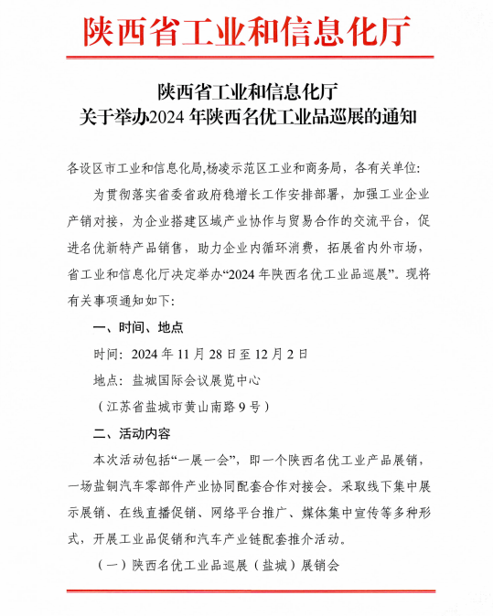省工信厅 关于举办2024年陕西名优工业品巡展及汽车零部件产业协同配套合作对接会的通知