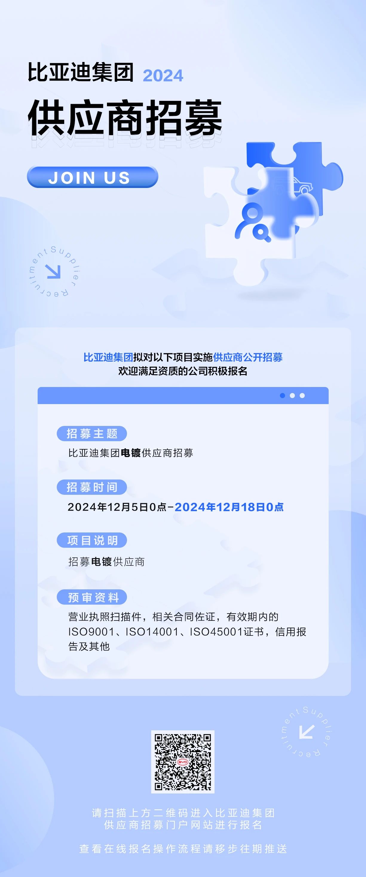 比亚迪集团电镀供应商招募公告