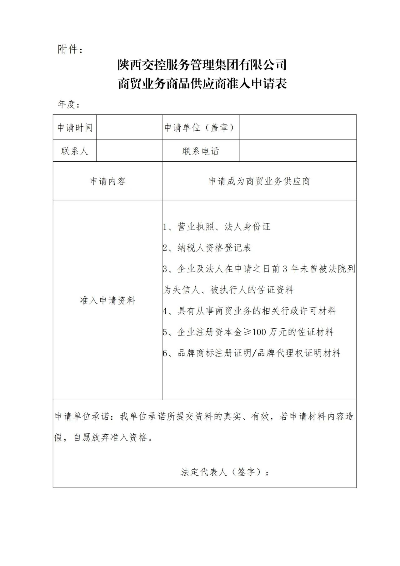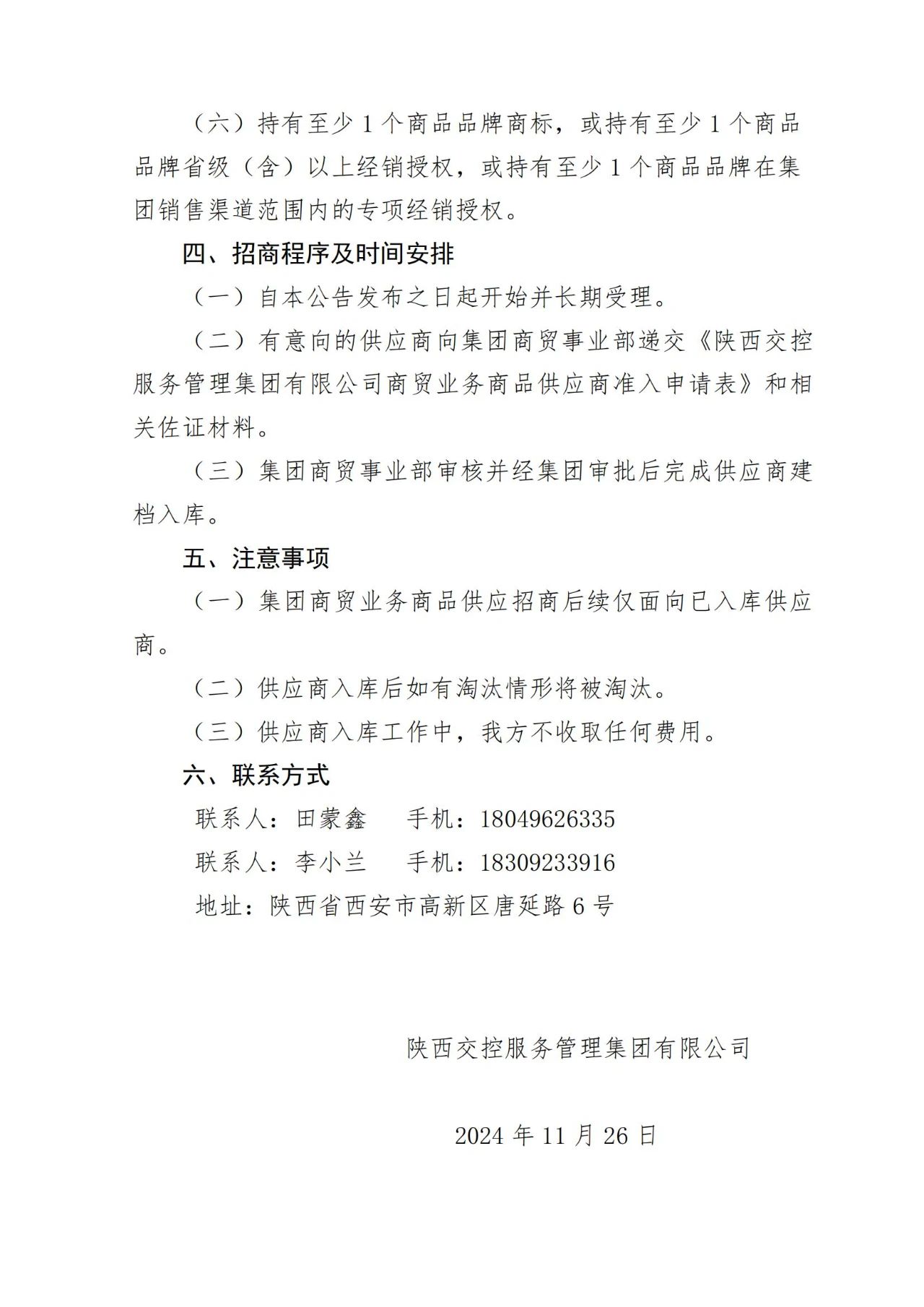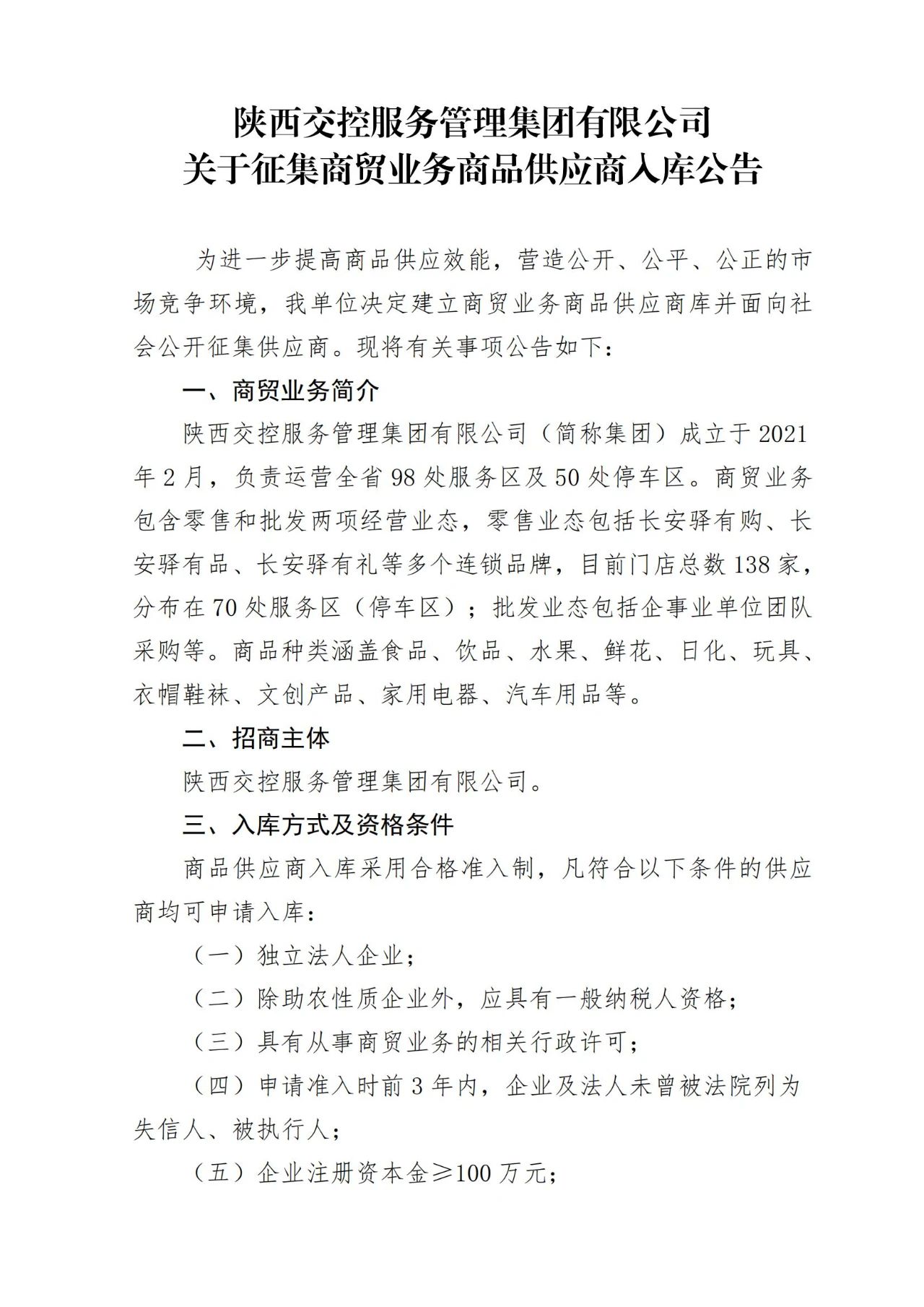 陕西交控服务管理集团有限公司关于征集商贸业务商品供应商入库公告