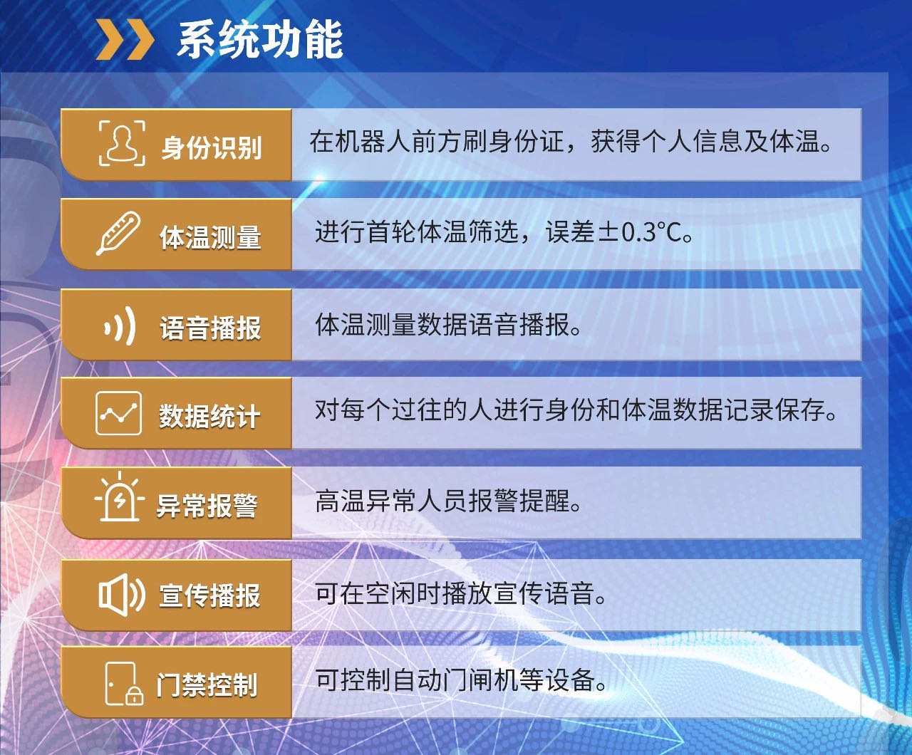 本次推出的检测机器人主要针对疫情防控场景定制的体温检测和预警,在原有的自然语音交互,人脸识别,自动引领等功能外,能够实现第一时间获得个人信息和检测人体温度功能,并实时反馈第三方,达到即时预警,即时防疫阻断!