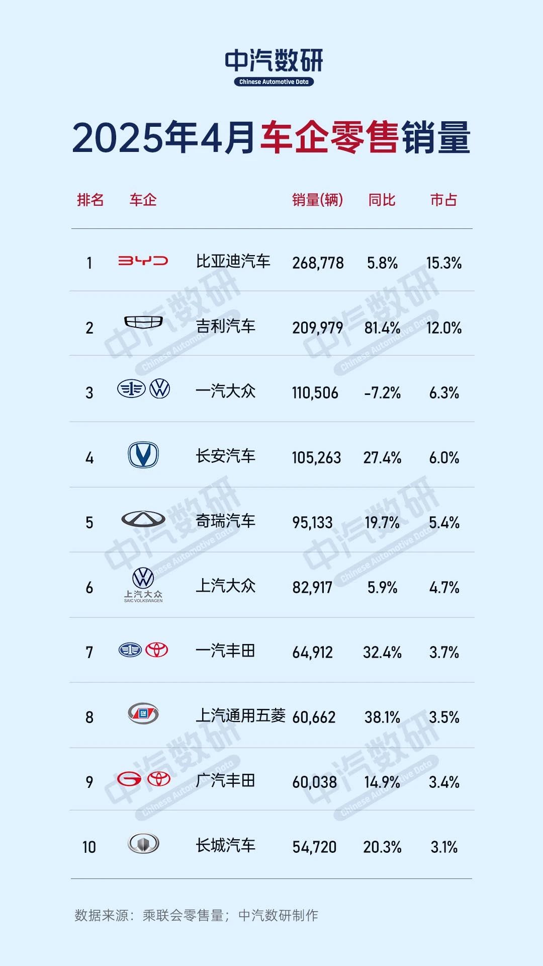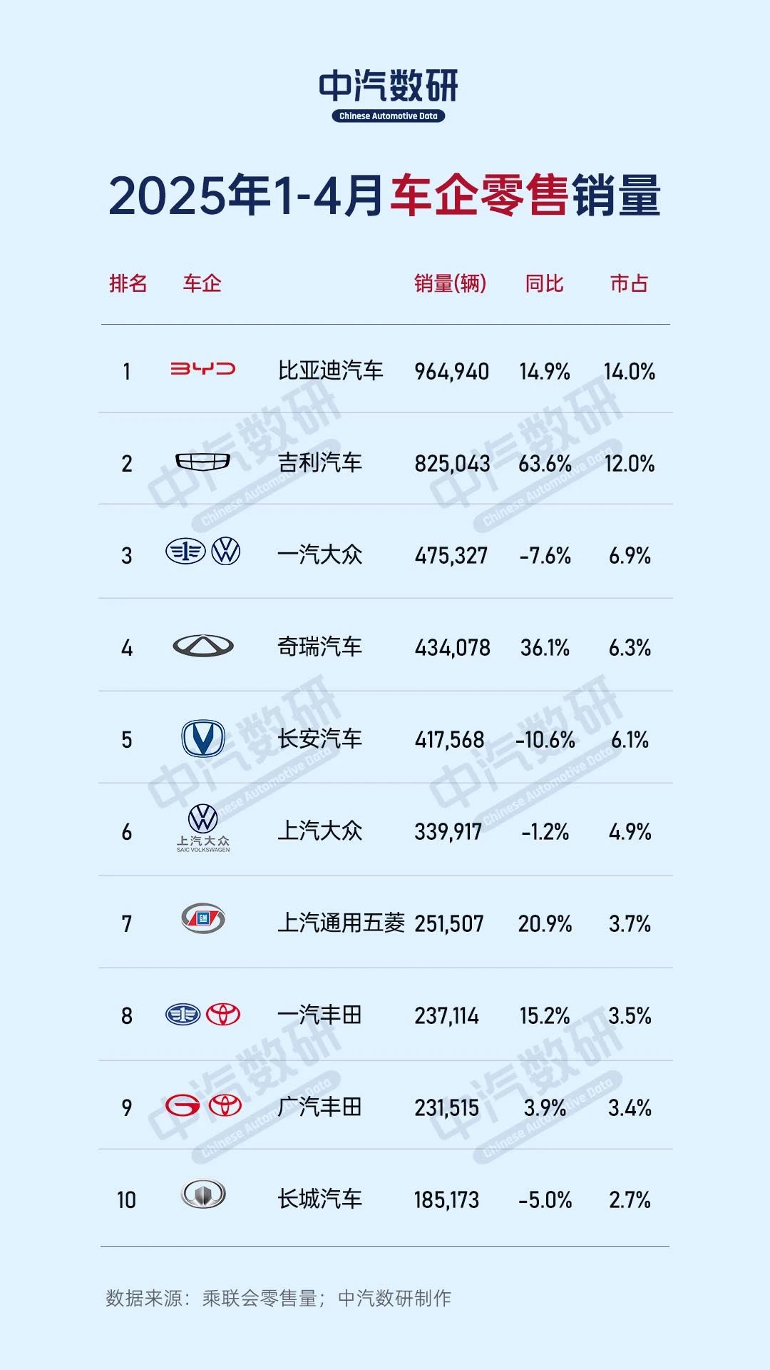 2025年4月及1-4月车企零售量(含新能源车企榜)