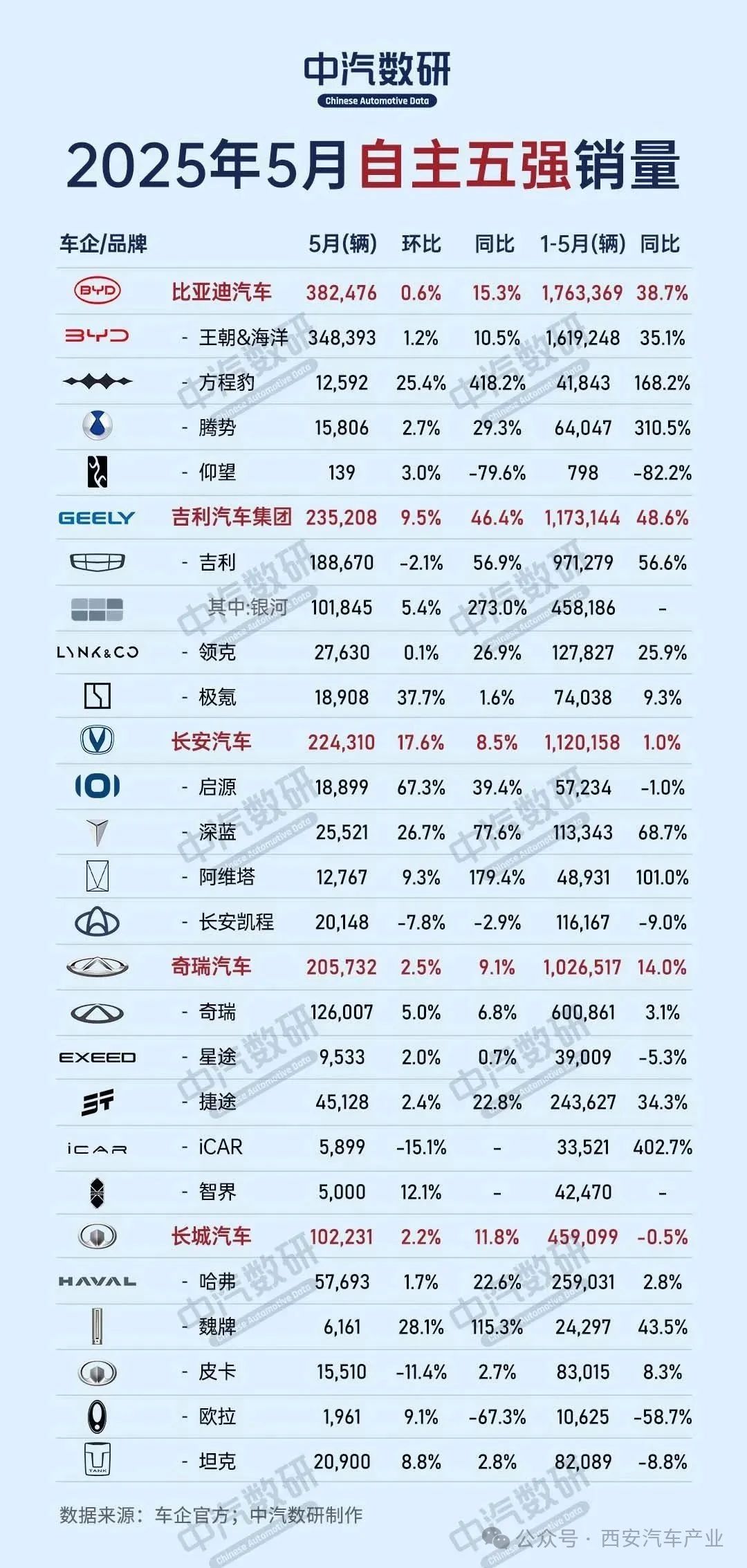 5月自主五强车企销量(比亚迪/吉利/长安/奇瑞/长城)