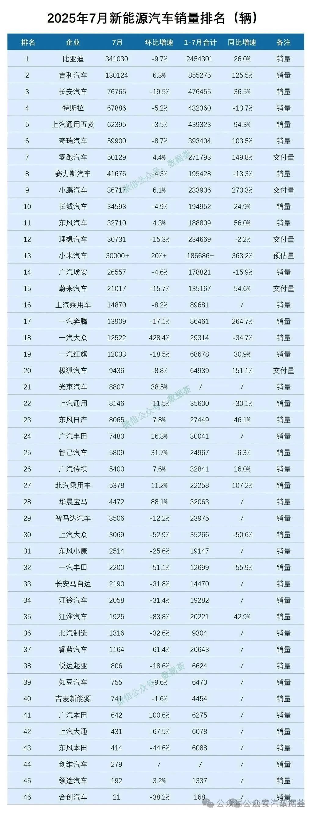 2025年7月新能源汽车销量排名