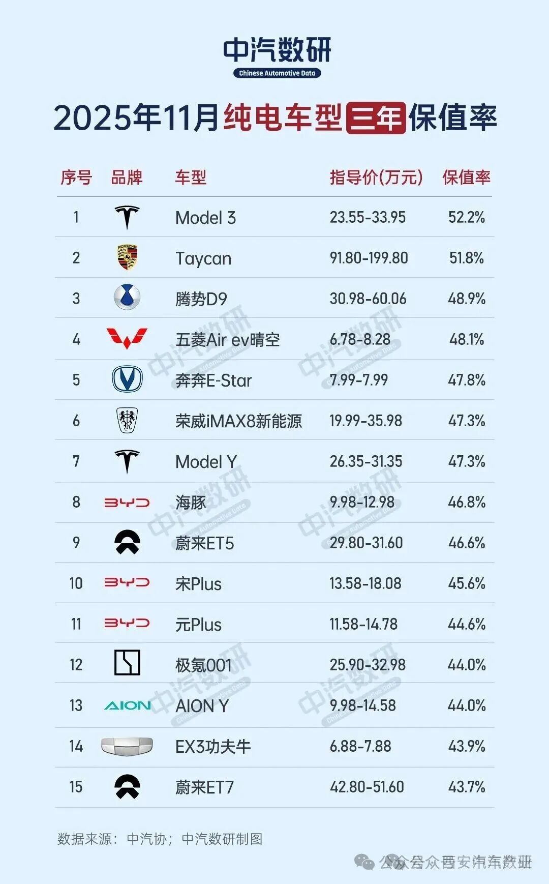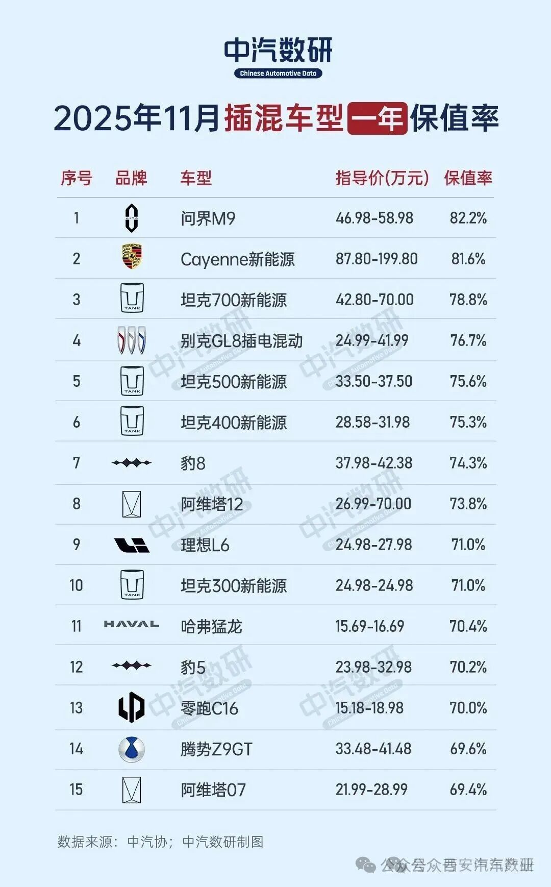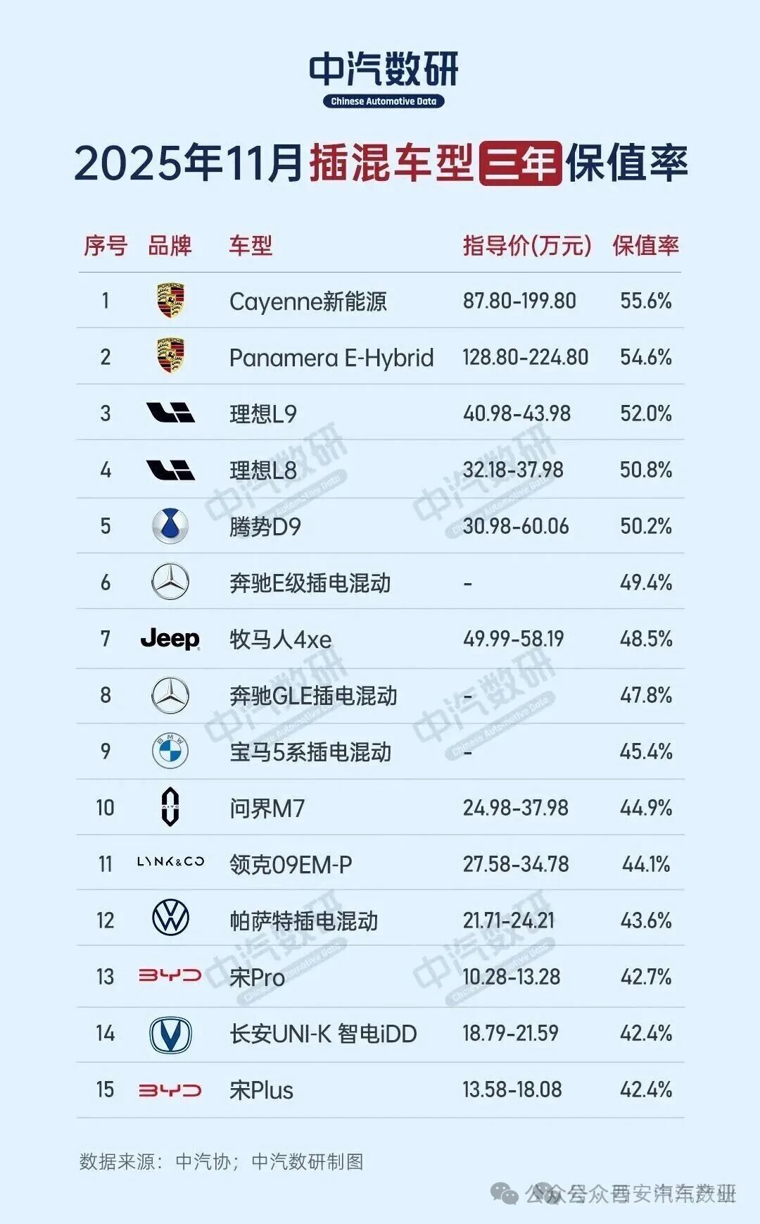 2025年11月新能源汽车保值率排行榜(插混/纯电)