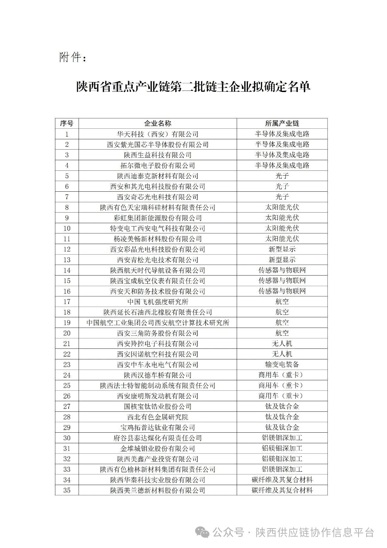 附 件: 陕西省重点产业链链主企业拟确定名单