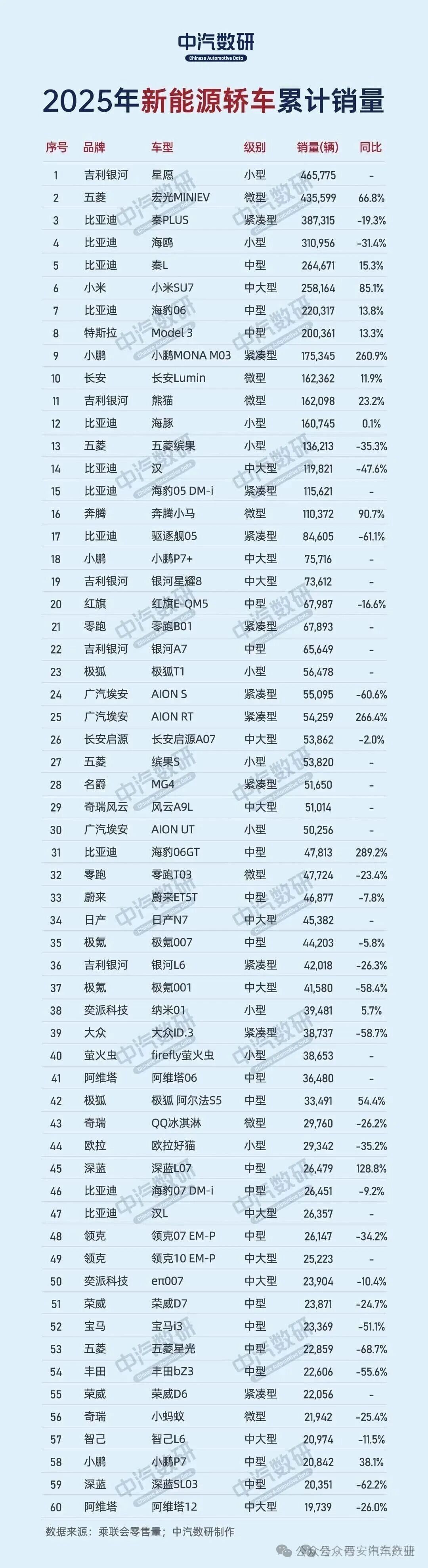 2025年度新能源汽车累计销量排行(轿车/SUV)