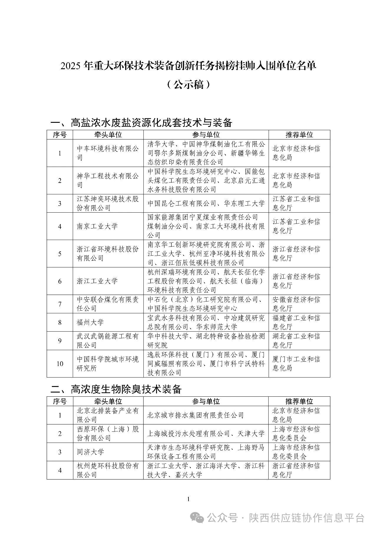 根据《关于组织开展2025年重大环保技术装备创新任务揭榜挂帅工作的通知》(工信厅节函〔2025〕399号)要求,经自愿申报、省级工业和信息化主管部门推荐、专家评审,遴选确定了2025年重大环保技术装备创新任务揭榜挂帅入围单位名单,现予公示。如有异议,请在公示期内将书面意见反馈至工业和信息化部节能与综合利用司。